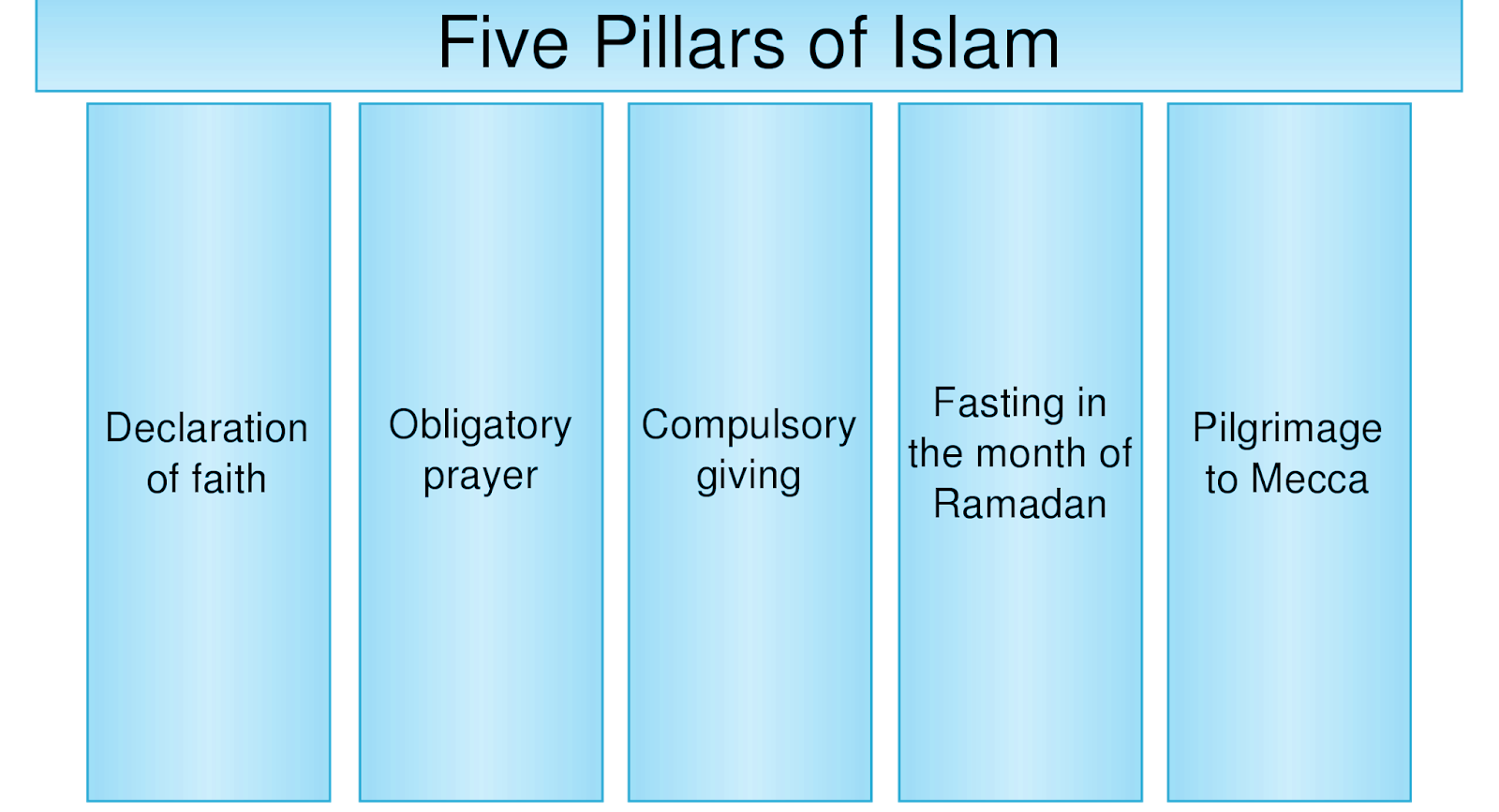 The Five Pillars of Islam are the five basic duties which a Muslim has to perform.